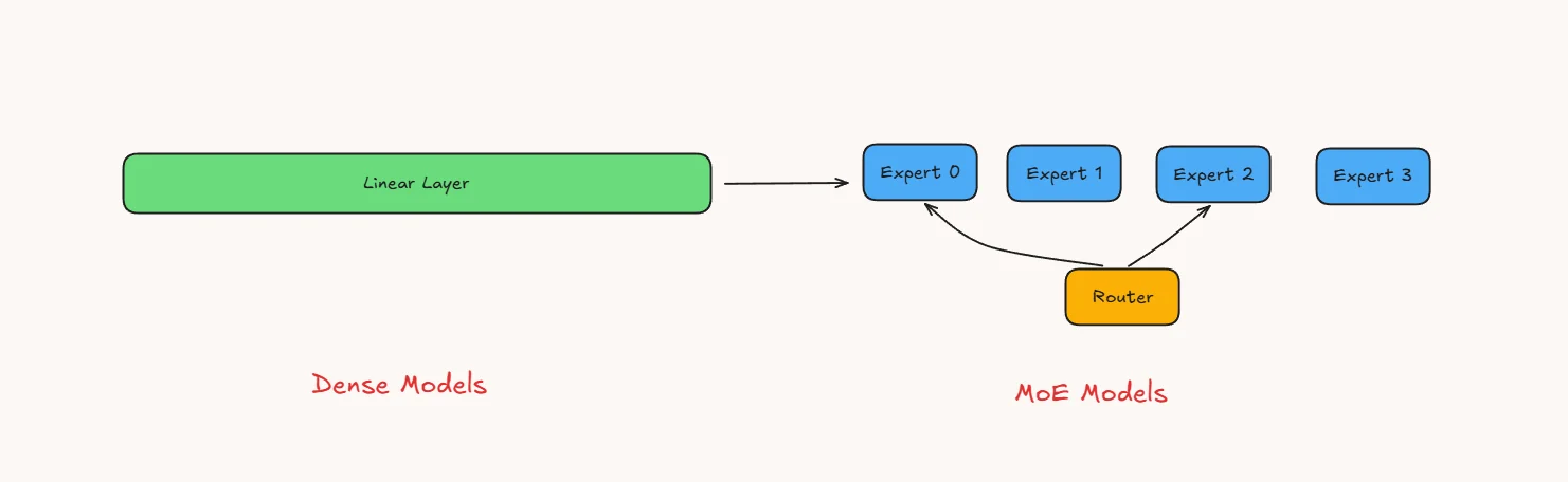 This design lets you scale total parameters without scaling compute per token. The model is large in capacity but cheap to run because only a fraction of experts fire each time.