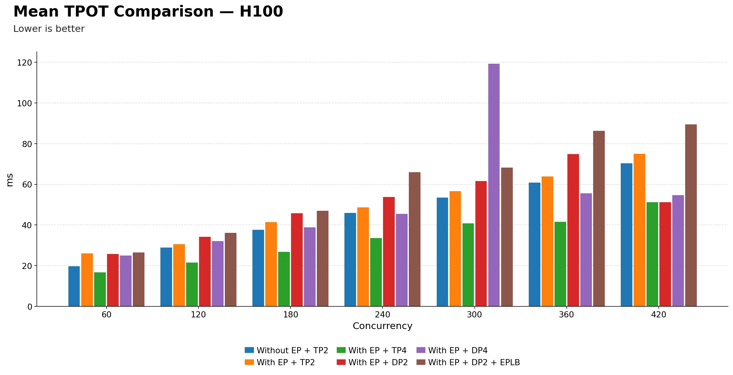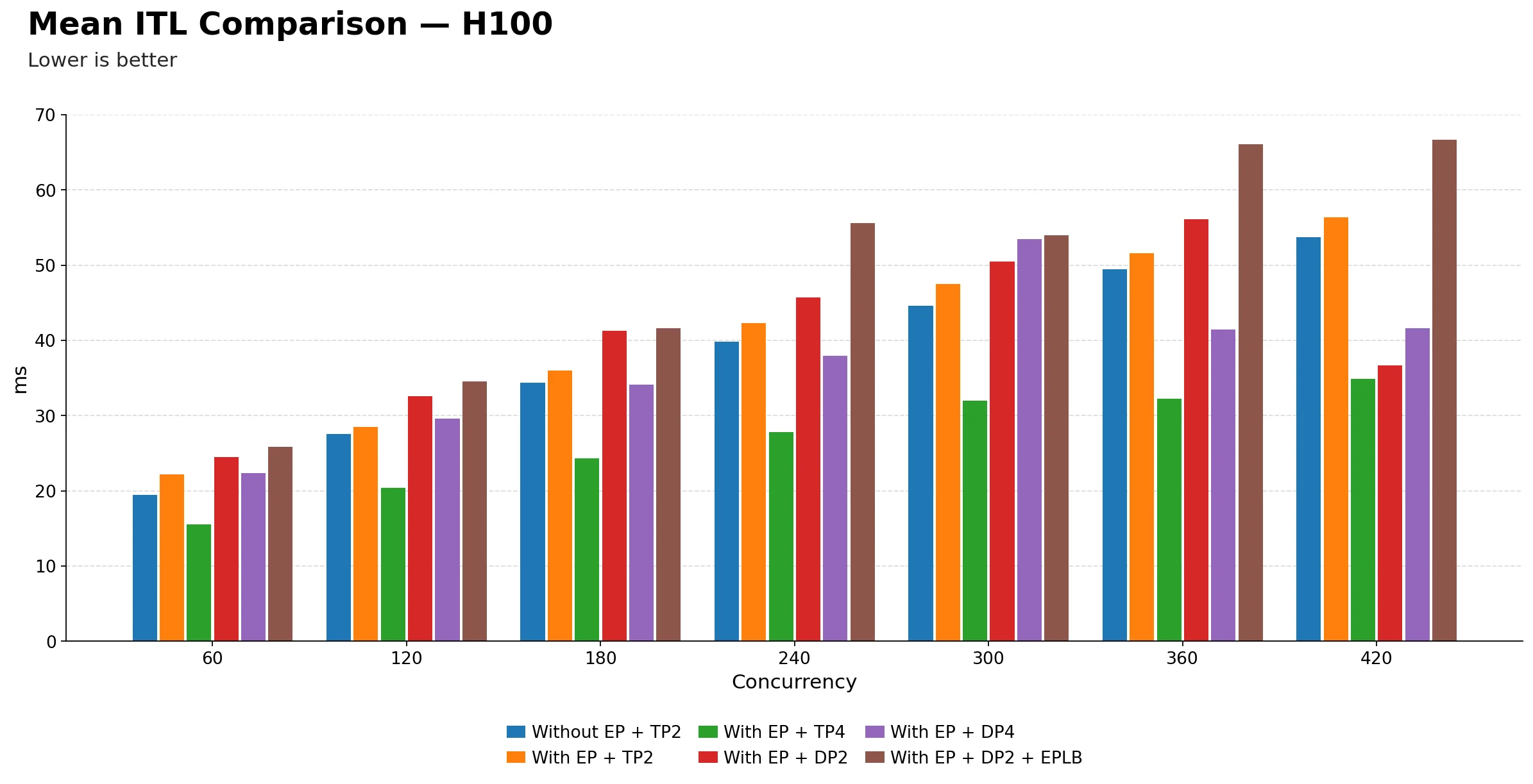 The key practical takeaway: EP + TP=4 is the best configuration for inter-token latency on H100. It delivers roughly half the ITL of the DP-based variants at high concurrency, with no anomalies across the full range. For any application where smooth, responsive token streaming is a priority, this is the clear recommendation.