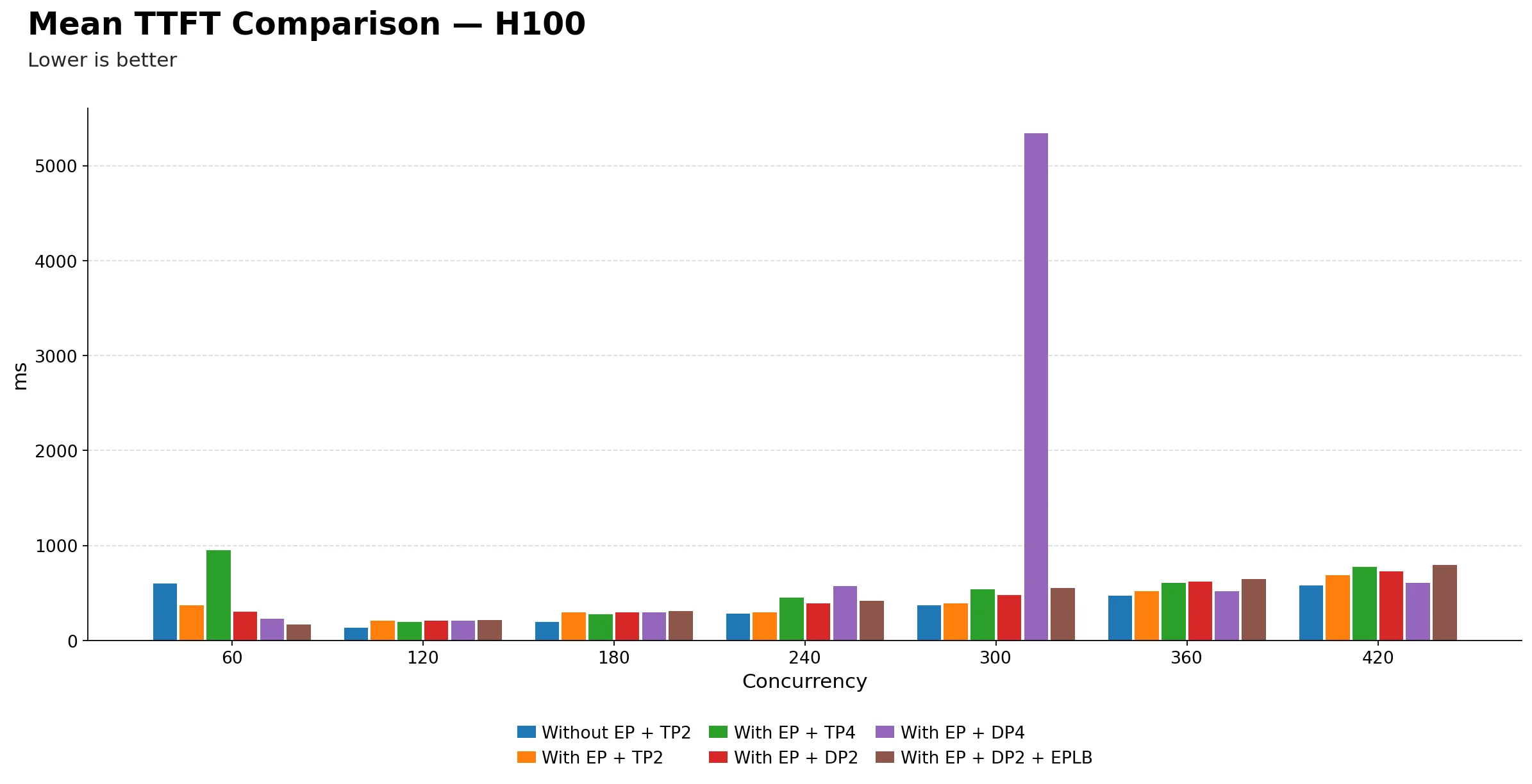 EP + DP=4 shows an anomaly at 300. It drops sharply to 3076.26 tok/s far below its neighbors at 240 (4927.87) and 360 (5805.79). This appears to be a significant outlier at that concurrency point. The benchmark table alone shows inconsistent behavior; identifying the exact cause would require profiler traces or engine logs.
