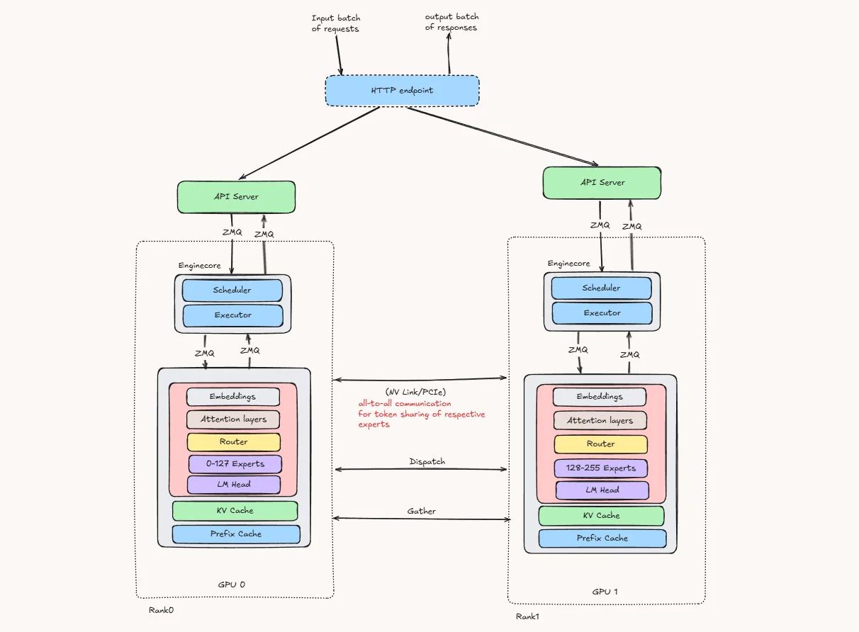 - Tokens are dispatched across GPUs: Since experts are distributed across GPUs, vLLM uses an all-to-all communication step to send each token to the GPU that owns its selected expert.
