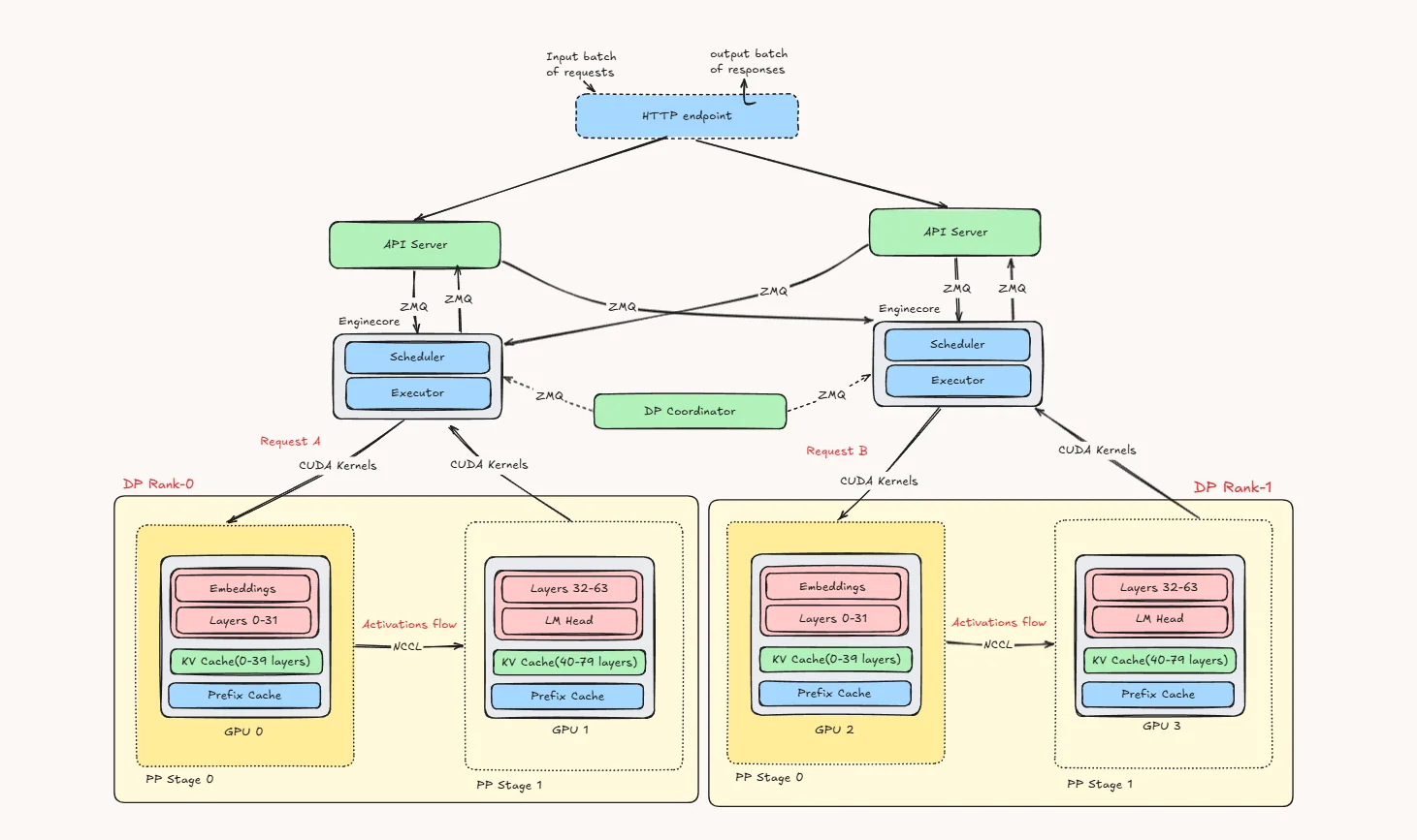 So if Request A is assigned to DP Rank 0, it first runs on GPU 0, where the early layers are computed. The intermediate activations are then sent to GPU 1, which finishes the remaining layers and produces the output. The same thing happens on the other side for Request B inside DP Rank 1, using GPU 2 and GPU 3.