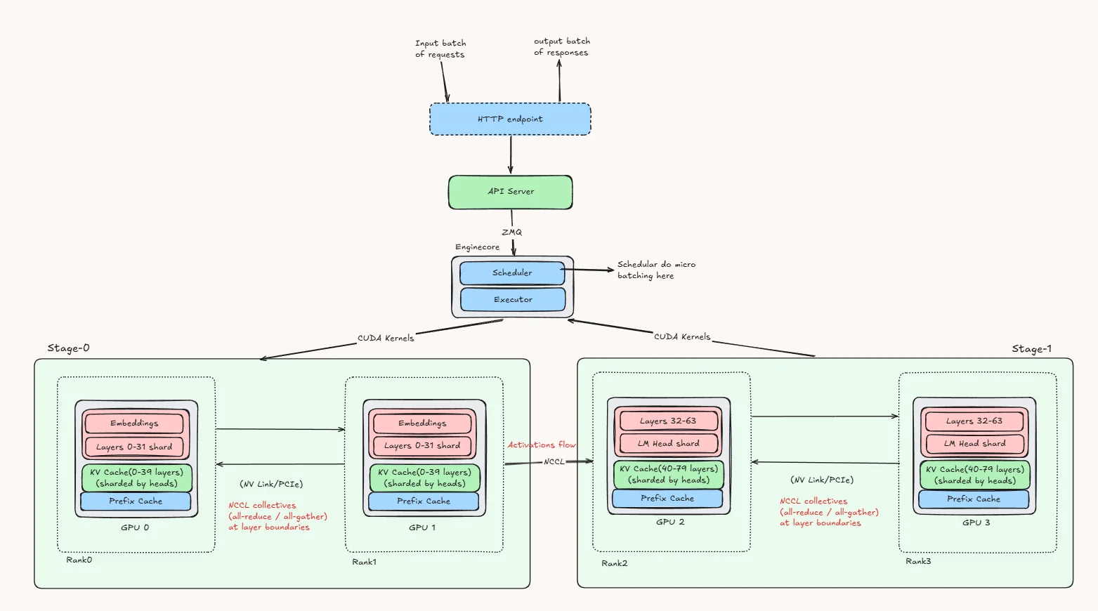 When a request arrives, it first runs through Stage 0, where both GPUs in that stage cooperate to process the embeddings and early layers. Once that part is done, the resulting hidden states are passed to Stage 1. There again, both GPUs in the second stage work together to process the later layers and produce the final logits.
