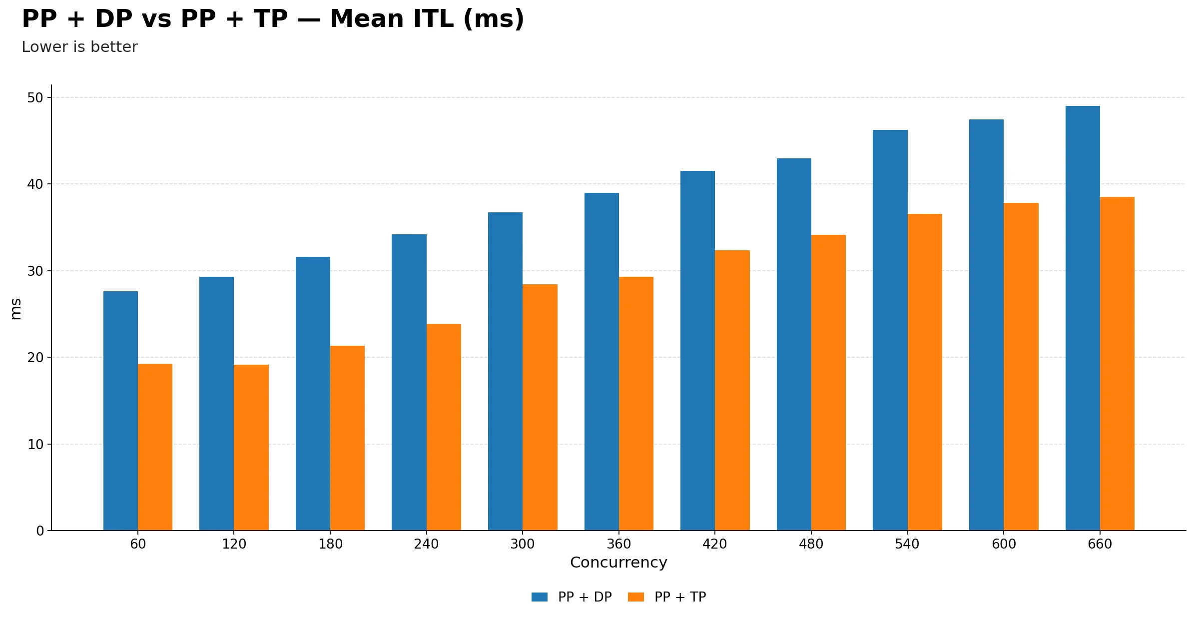 PP + TP maintains lower inter-token latency at every single concurrency point. The orange bars are consistently shorter than the blue bars across the full range, with no crossover. This is the most visually clean result in the entire comparison. PP + TP simply wins on ITL everywhere.