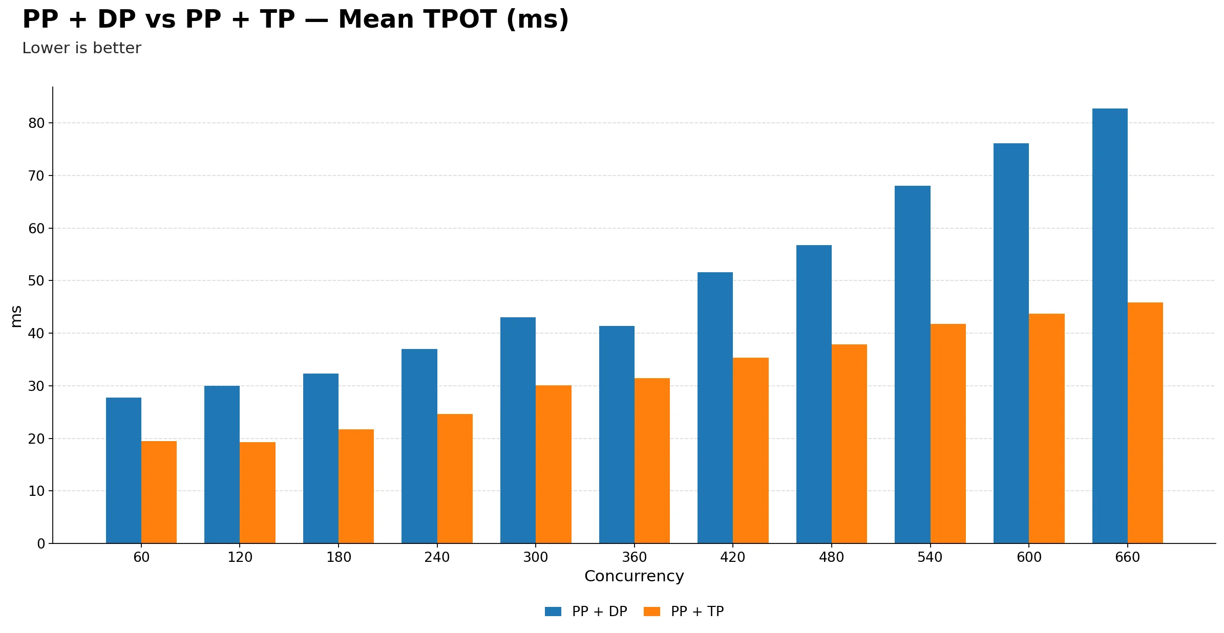 PP + DP TPOT accelerates sharply after 420. It jumps from about 51 ms at 420 to 68 ms at 540 and then 83 ms at 660, a steep climb in the high-concurrency region. PP + TP by contrast stays relatively flat from 420 onwards, rising only from 35 ms to 46 ms in the same range.