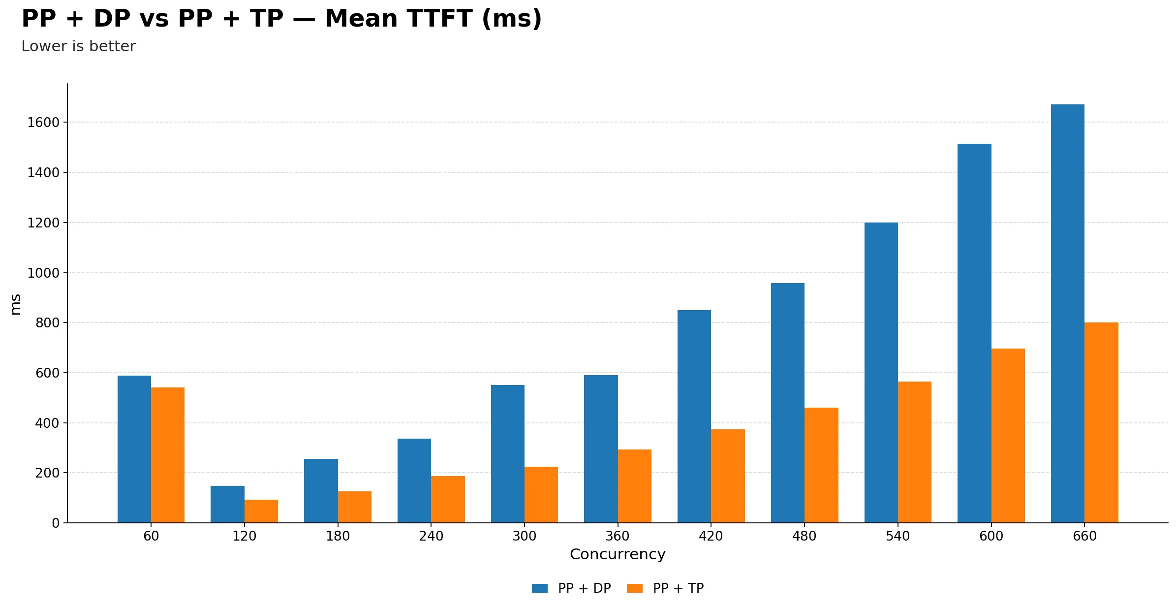 PP + TP is consistently better on TTFT across the full concurrency range. The gap starts modest at 60, roughly 580 ms vs 540 ms, but widens dramatically at higher concurrency, reaching about 1660 ms for PP + DP versus 800 ms for PP + TP at 660. So PP + TP is more than twice as responsive for first-token delivery under heavy load.