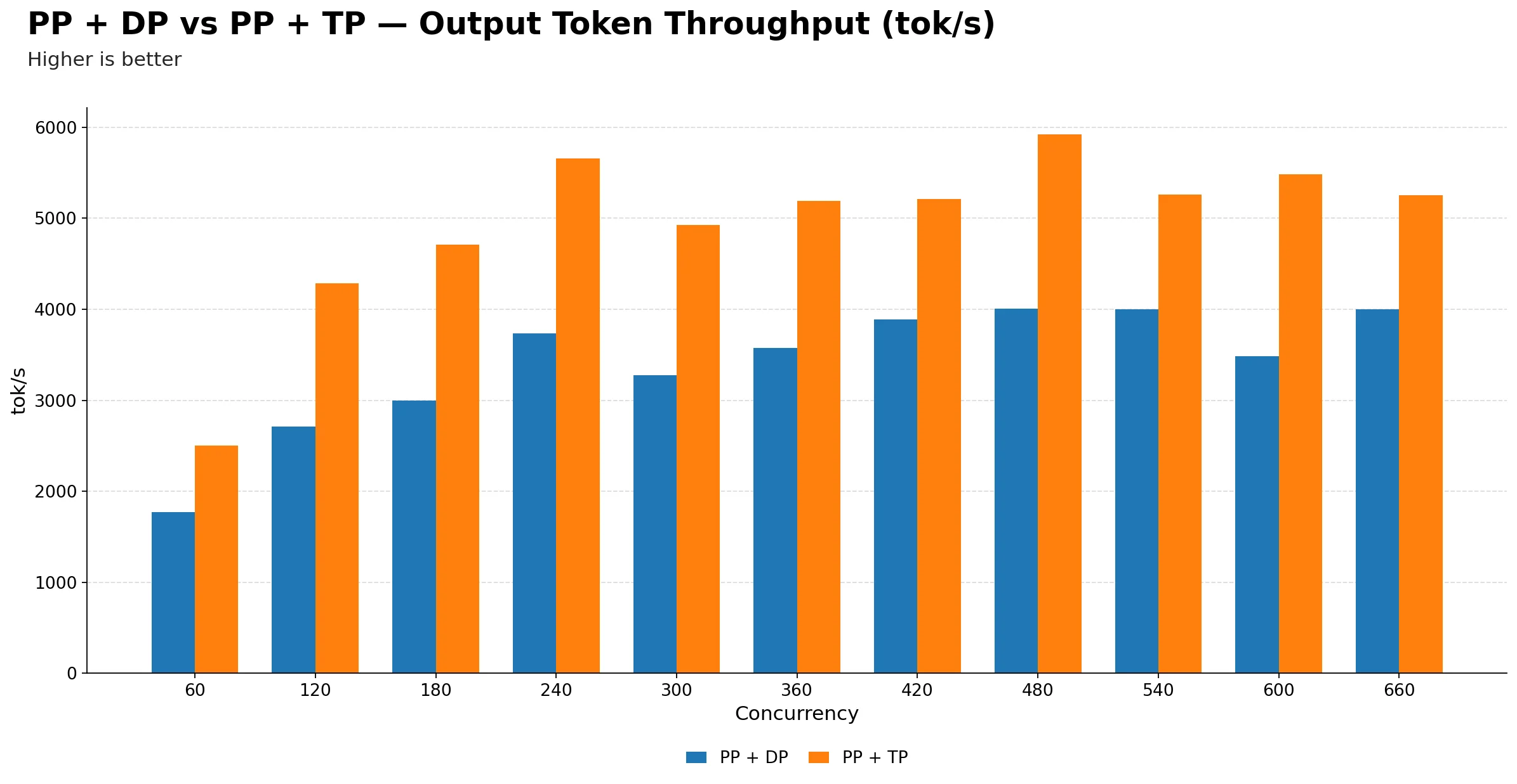 Beyond 480, extra concurrency mostly hurts latency without giving meaningful throughput gains for either configuration. PP + TP plateaus in the 5.2k–5.9k tok/s band while PP + DP hovers around 3.5k–4.0k tok/s. The throughput advantage of PP + TP is persistent and does not narrow at high load.