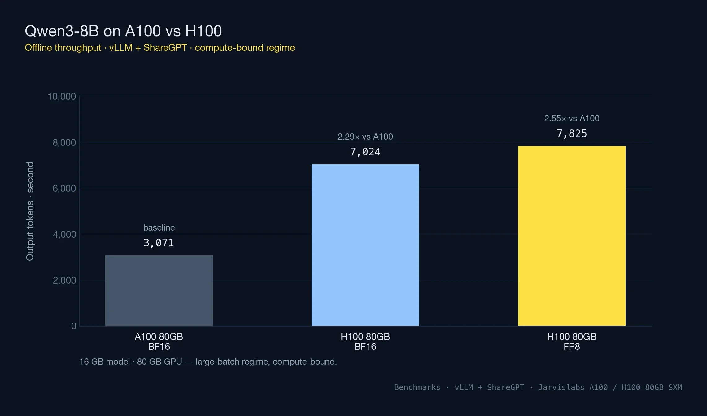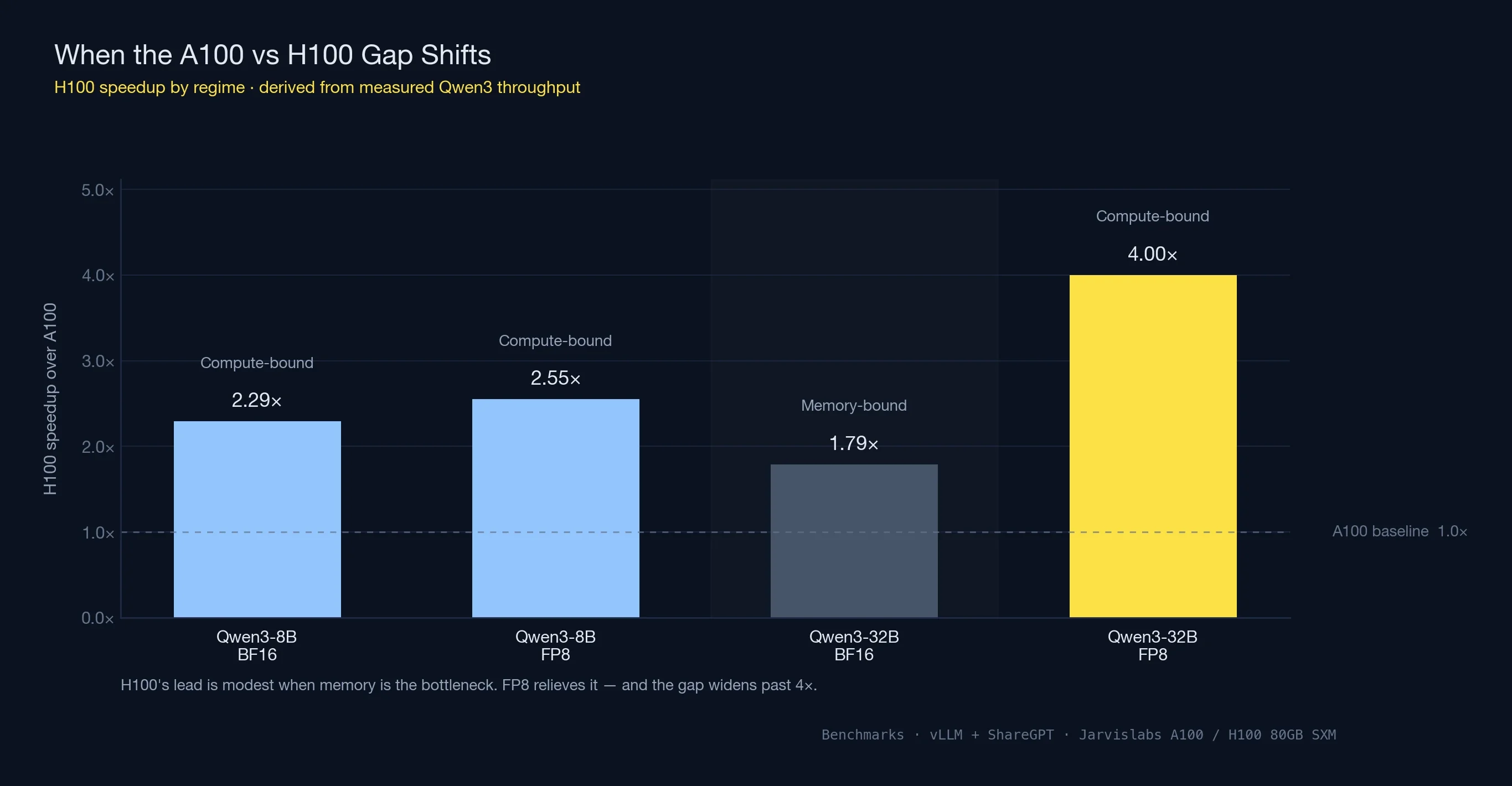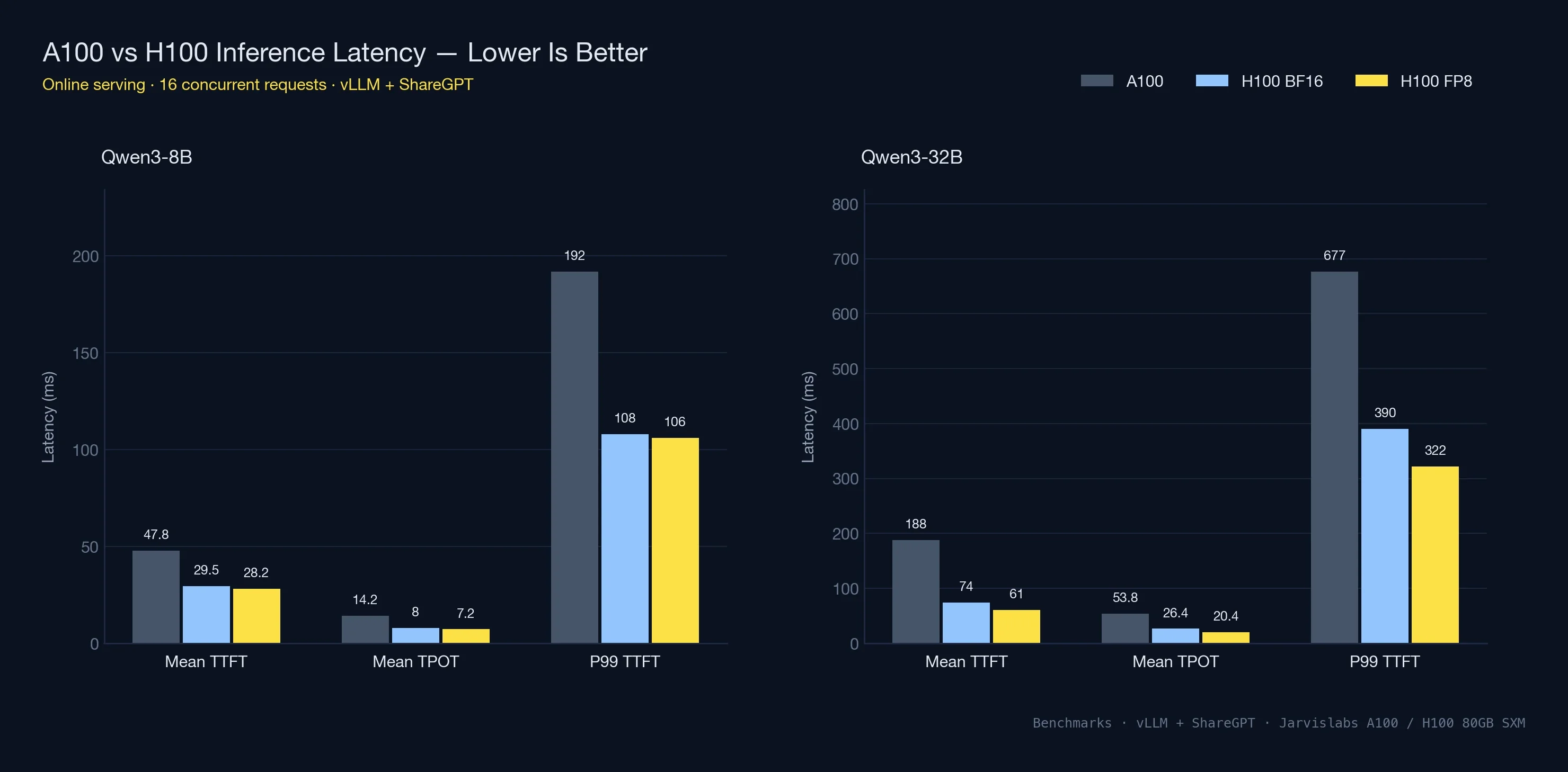 The NVIDIA H100 is 2-4x faster than the A100 across training and inference workloads, while the A100 costs 45% less per hour. In our benchmarks on Jarvislabs infrastructure, H100 delivered 2.29x higher throughput on Qwen3-8B and up to 4x on Qwen3-32B with FP8 — but A100 at $1.49/hr remains the better value for fine-tuning and dev work where maximum speed isn't critical.