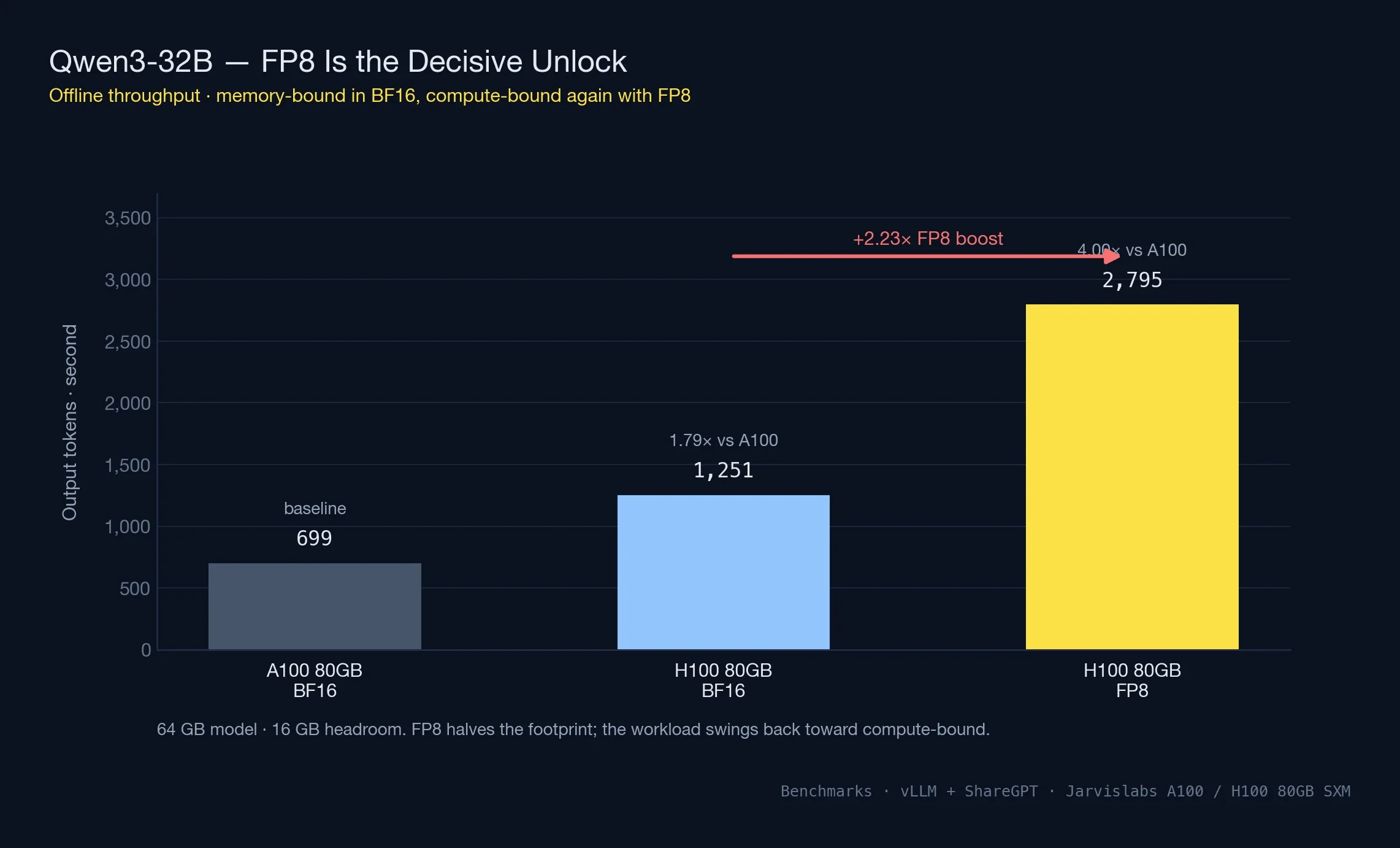 - A100 → H100: 2.7x CUDA cores, 67% more bandwidth, native FP8, Transformer Engine, 3x faster training